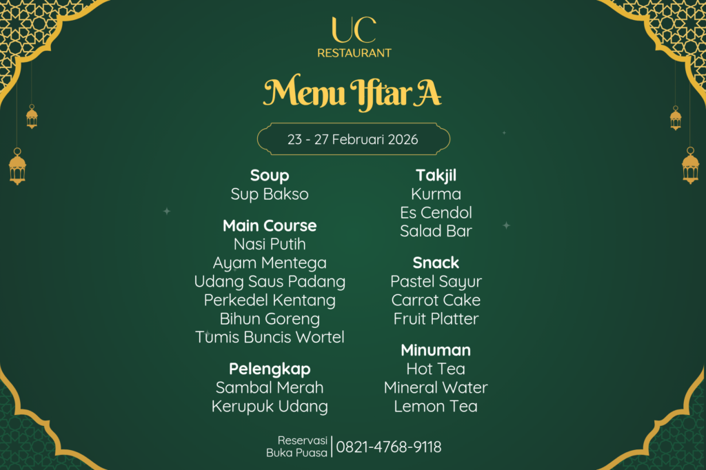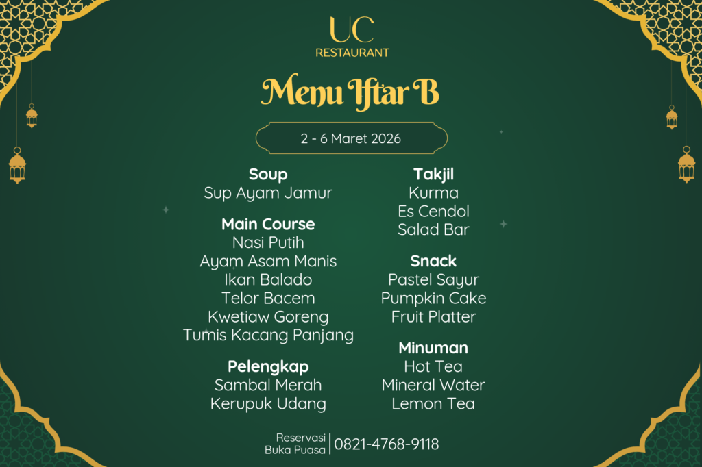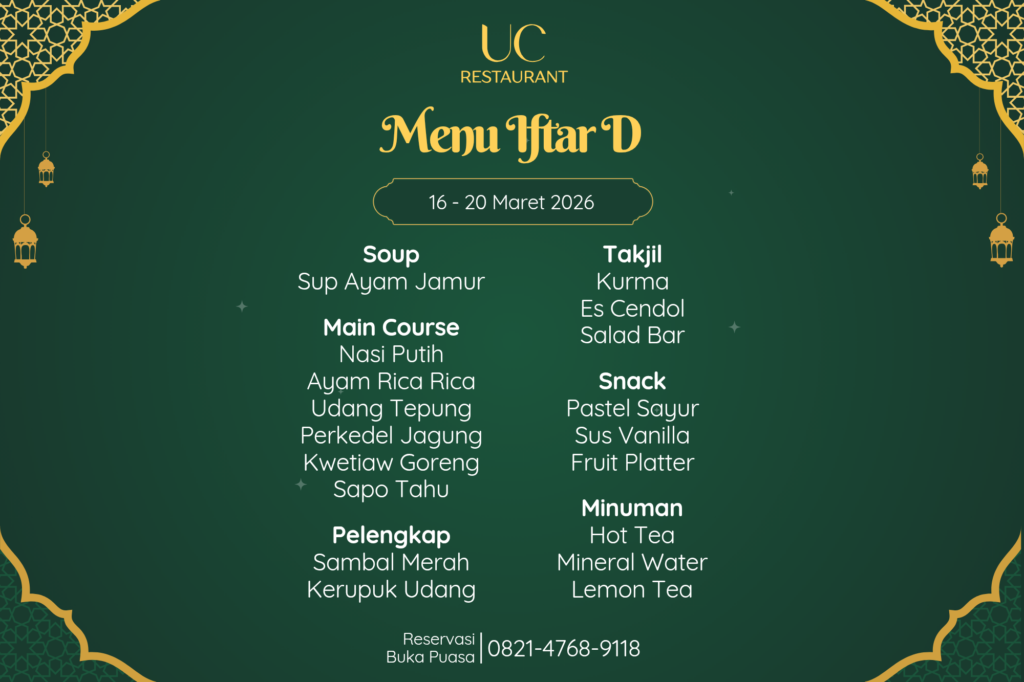 Rayakan momen buka puasa di UC Restaurant dengan paket Ramadhan Feast. Makan sepuasnya (AYCE) Senin-Jumat jam 18.00-20.30. Promo grup Beli 5 Gratis 1 tersedia!