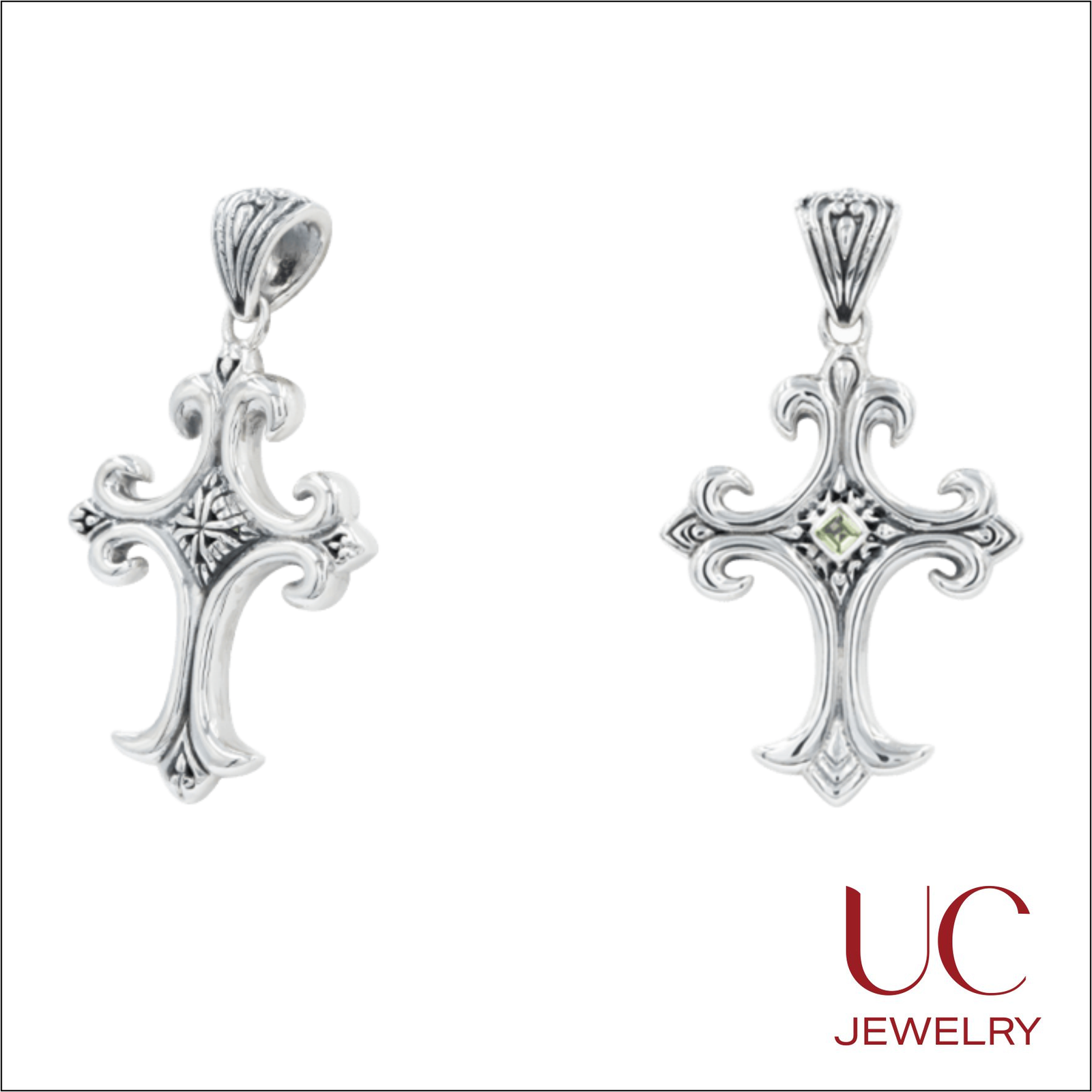 Front View (Right): The center is set with a square-cut peridot (or similar light green gemstone), framed by a delicate beaded bezel. The arms of the cross terminate in graceful, stylized fleur-de-lis curves.