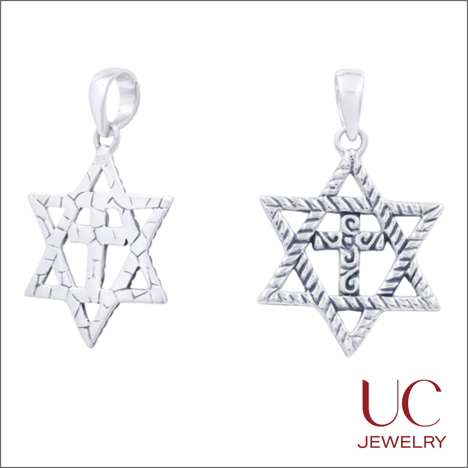 Front View (Right): The right side of the image displays the front of the pendant. It features a highly detailed, oxidized finish that highlights a textured, rope-like pattern on the star’s frame. The central cross is adorned with elegant scrollwork or filigree detailing.