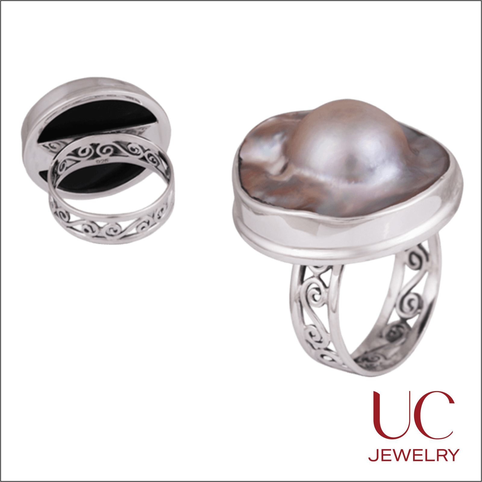 Contemporary statement ring that blends organic textures with elegant, artisanal metalwork. It features a large, Baroque Mabe pearl as its centerpiece, known for its unique, non-spherical shape and lustrous iridescent sheen.
