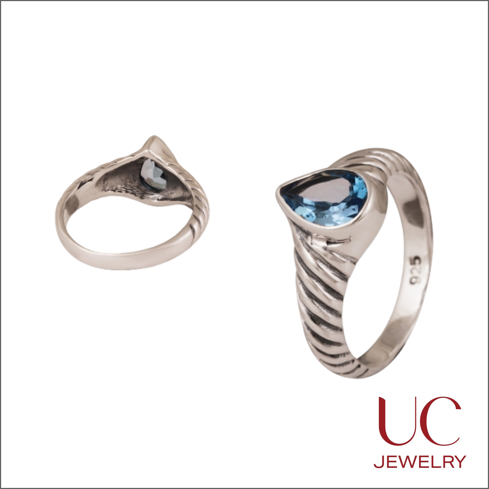 Gemstone: A vibrant, pear-shaped blue stone that sits flush within the setting for a sleek, snag-free finish.