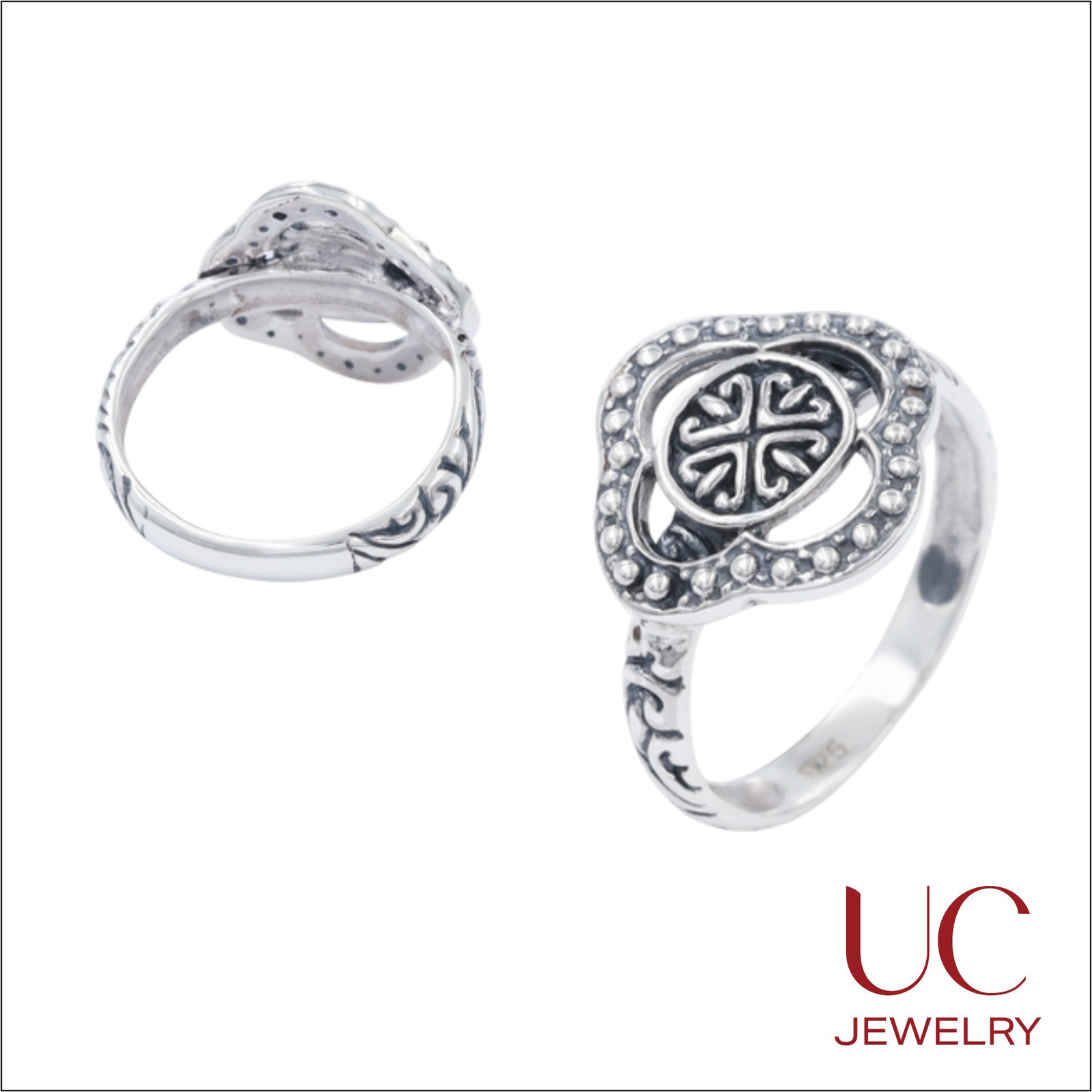 This is a high-quality product image featuring a Sterling Silver Artisan Ring from UC Jewelry, showcased from two different angles to highlight its intricate 360-degree craftsmanship.